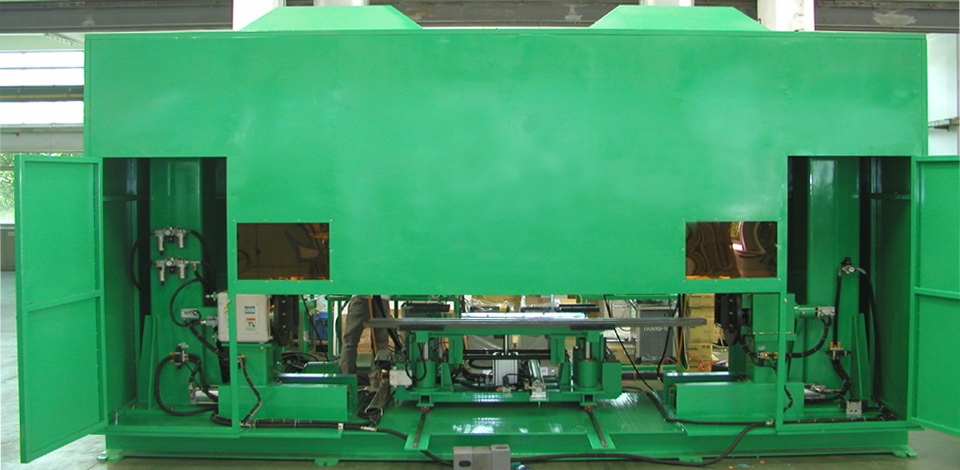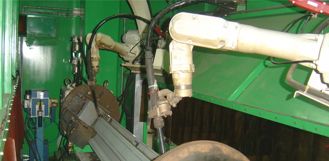 采用全封闭防护系统,两台安装在龙门架上的天吊焊接机器人,各配备一台全数字焊接电源,对上、下角座同时进行焊接,工件从一端进入,焊接完成后,从一端送出,焊接时工件旋转,与机器人配合、协调焊接。输送工件、工件定位、 旋转焊接,全部自动完成。该系统的开发应用对集装箱角柱的自动化生产制造有很大促进作用。